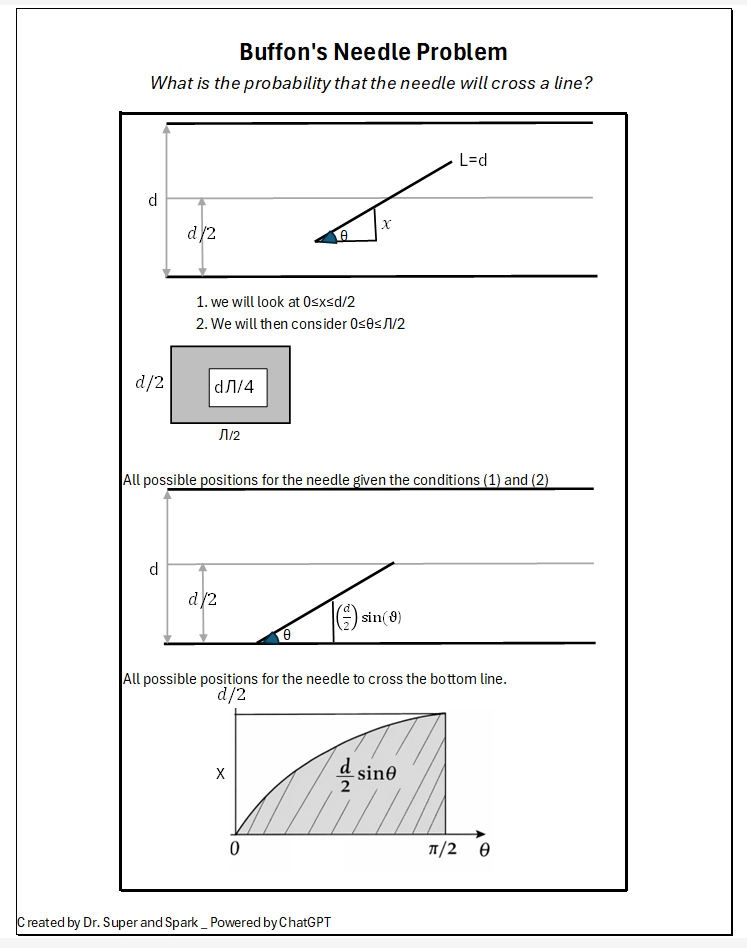 Estimate π by dropping needles on parallel lines (geometry + probability).